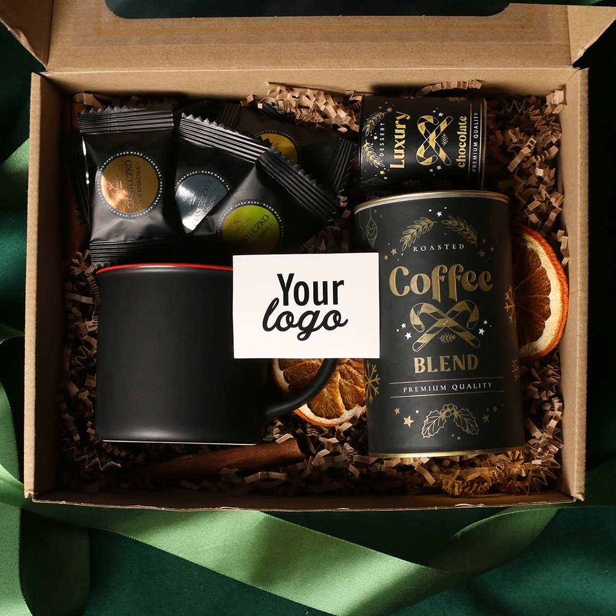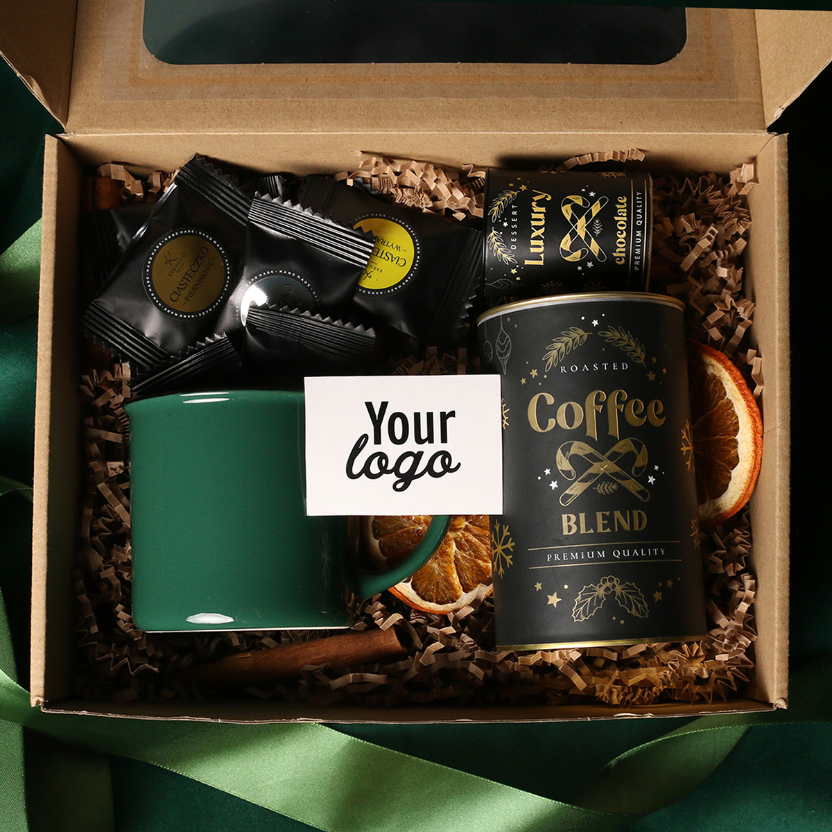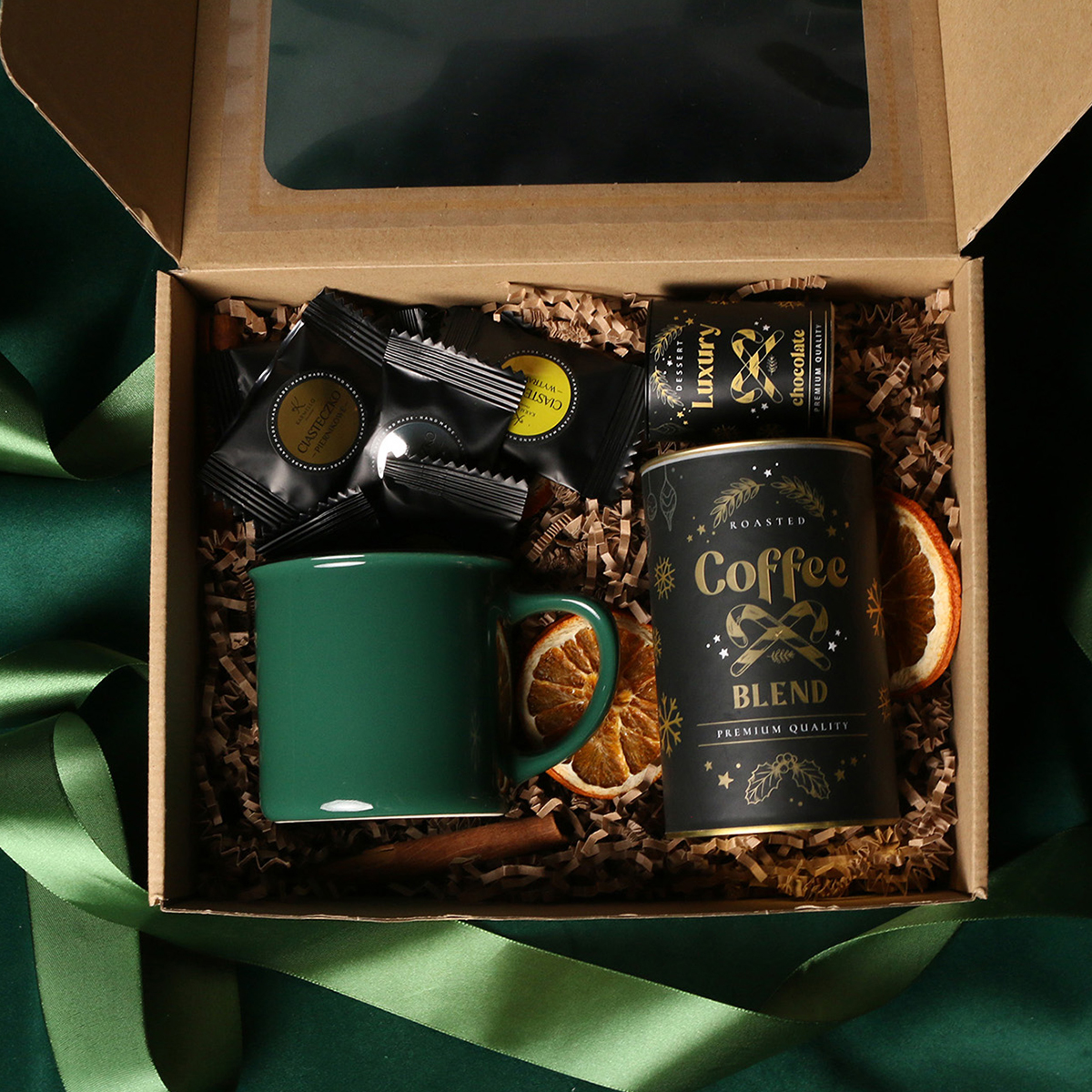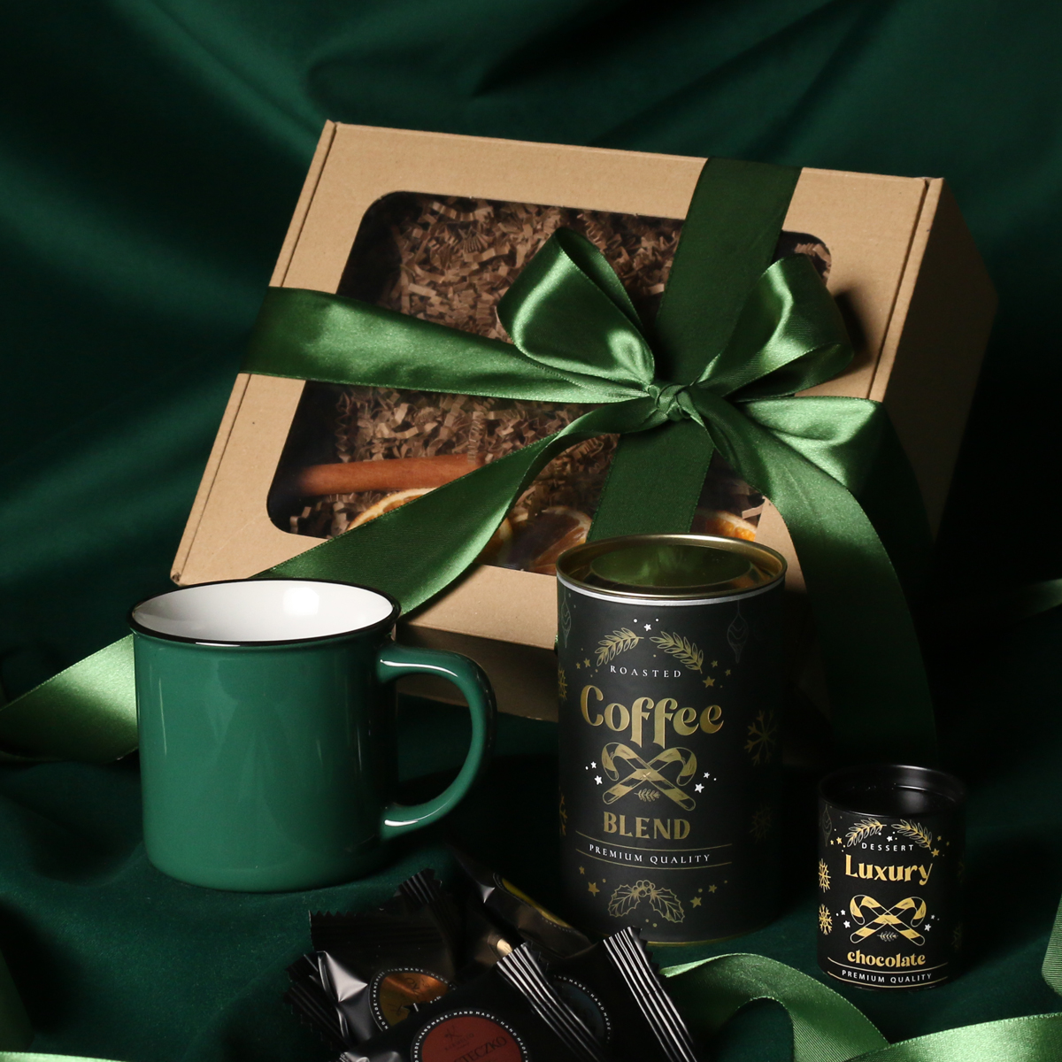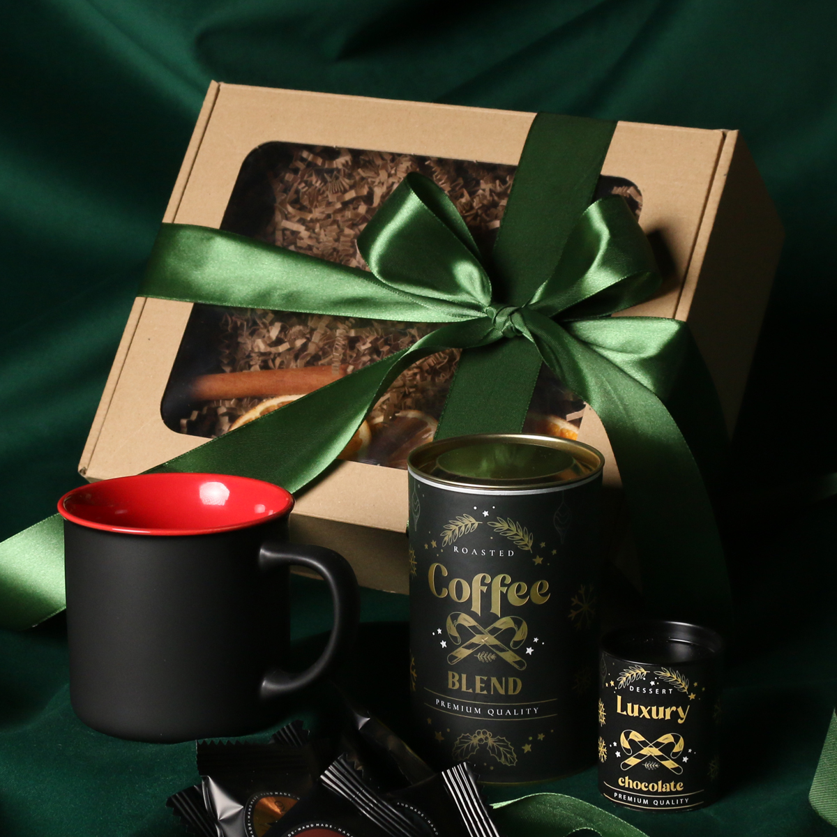 Kubek Loft w kolrze ciemnozielonym lub Loft Supreme w kolorze czerwonym i czarnym Rozgrzewająca belgijska czekolada do picia 40g Aromatyczna kawa ziarnista Arabica Brazil Cerrado Mineiro w puszce 150g, 8 sztuk czekoladek / ciasteczek - mix smaków, eleganckie dodatki zdobiące opakowanie: dopasowana kolorystycznie wstążka lub obwoluta