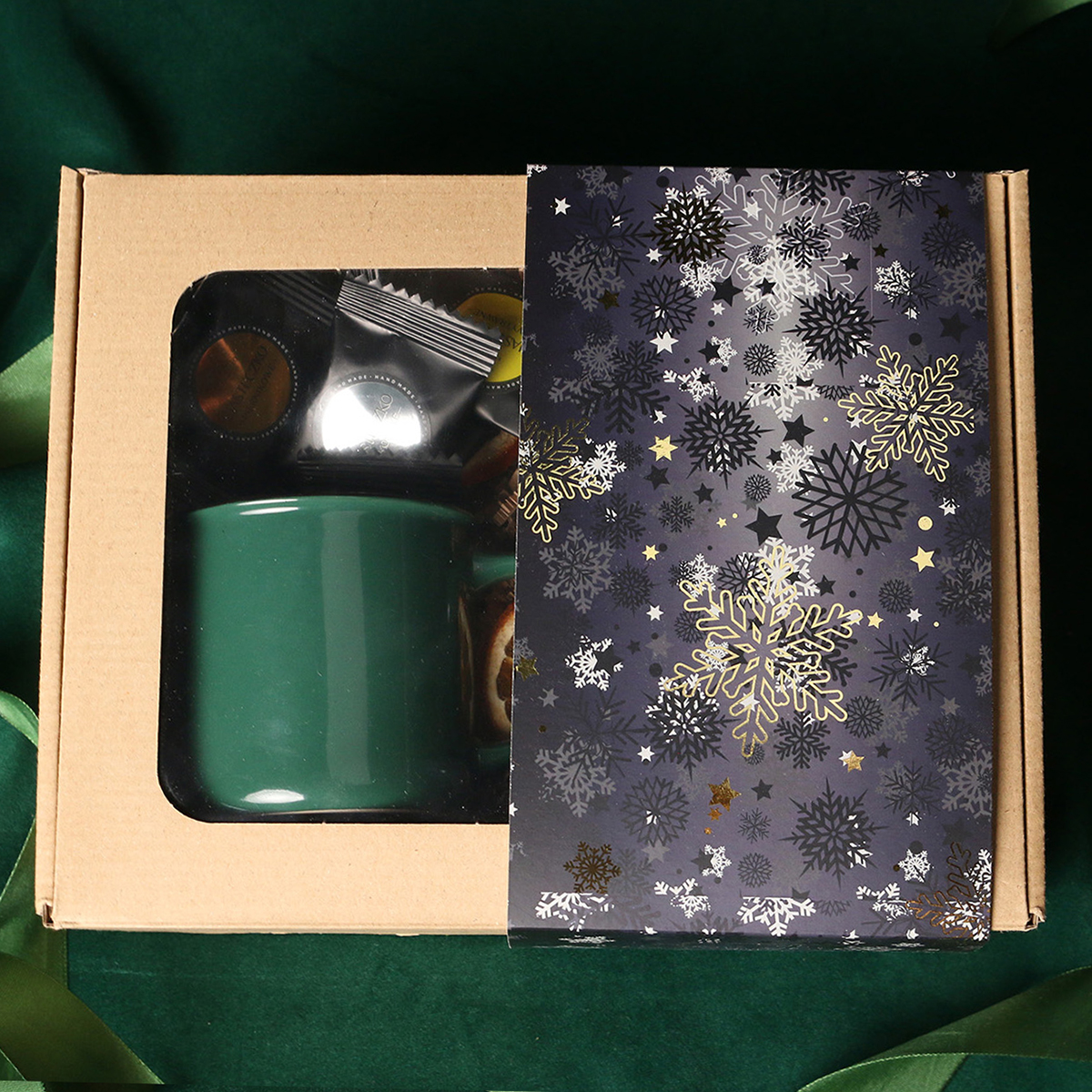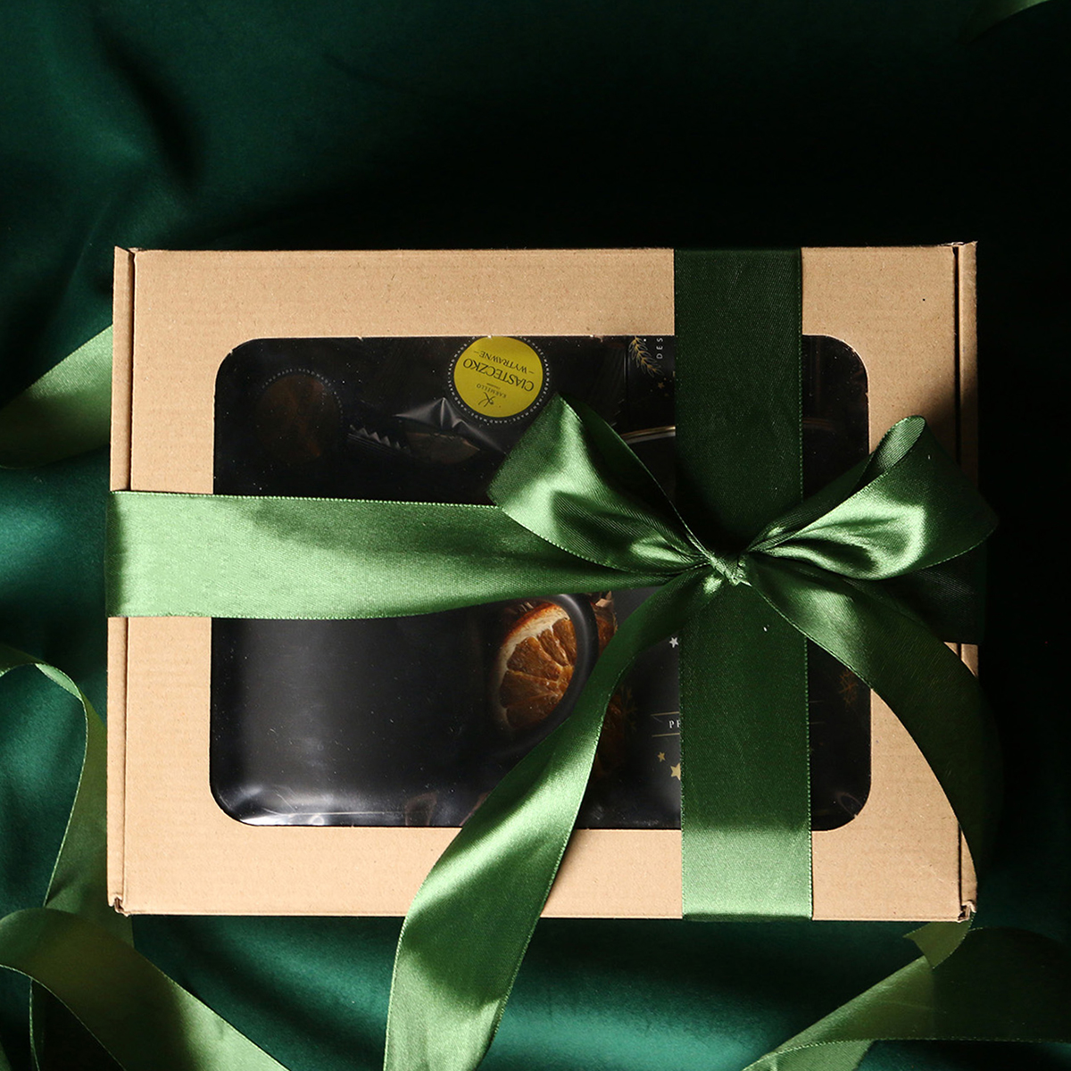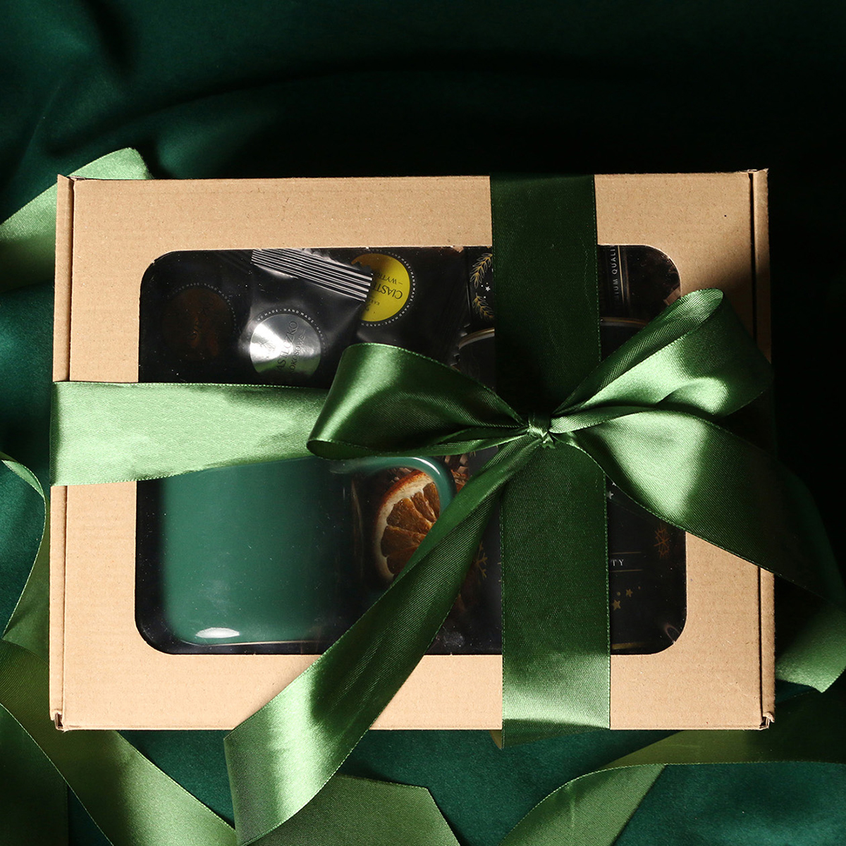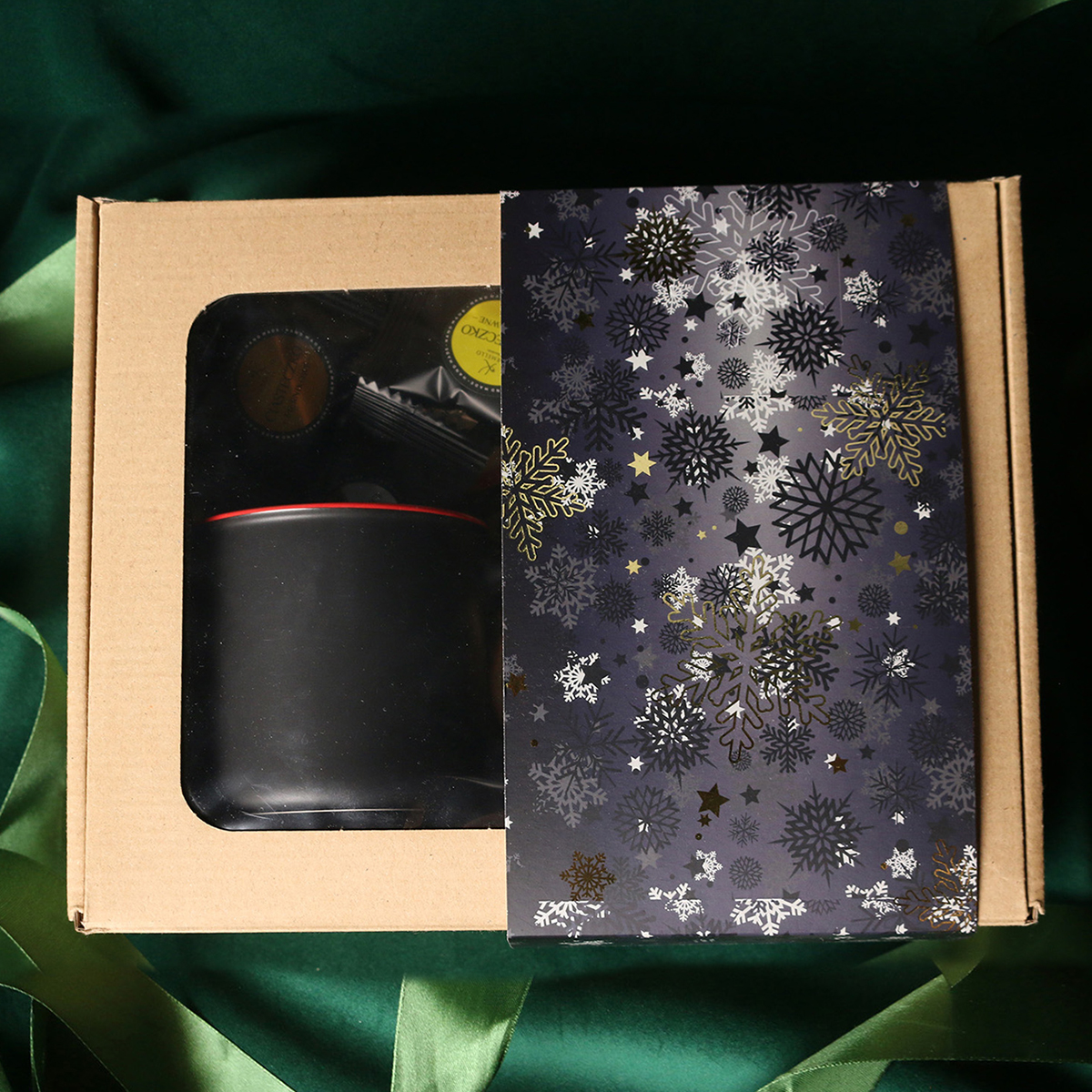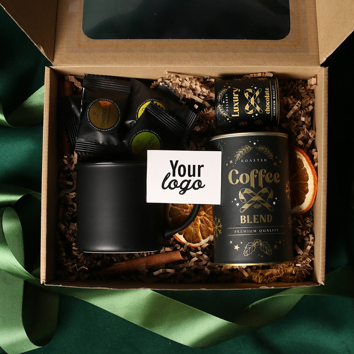 Kubek Loft w kolrze ciemnozielonym lub Loft Supreme w kolorze czerwonym i czarnym Rozgrzewająca belgijska czekolada do picia 40g Aromatyczna kawa ziarnista Arabica Brazil Cerrado Mineiro w puszce 150g, 8 sztuk czekoladek / ciasteczek - mix smaków, eleganckie dodatki zdobiące opakowanie: dopasowana kolorystycznie wstążka lub obwoluta